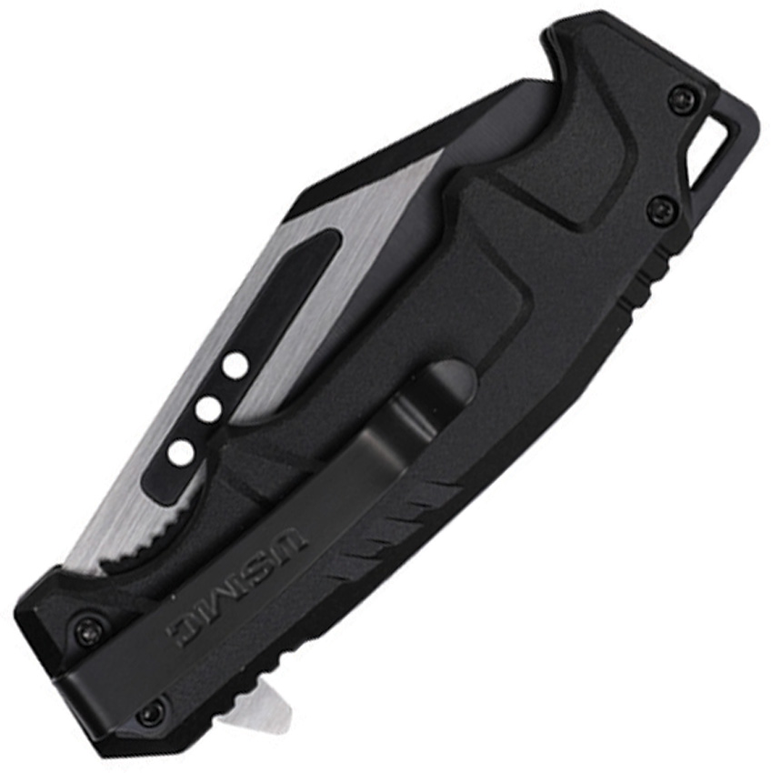Assisted opening. 4.5″ (11.43cm) closed. 3.38″ (8.59cm) two-tone finish stainless Wharncliffe blade. Black anodized aluminum handle. Extended tang. Lanyard hole. Pocket clip. Boxed.
