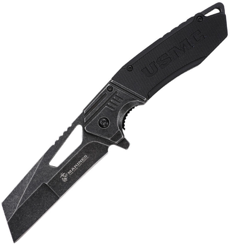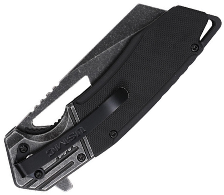 Assisted opening. 4.75″ (12.07cm) closed. 3.38″ (8.59cm) black stonewash finish stainless Wharncliffe blade. Black G10 handle. Stainless bolster(s). Extended tang. Thumb pull. Lanyard hole. Pocket clip. Boxed.
