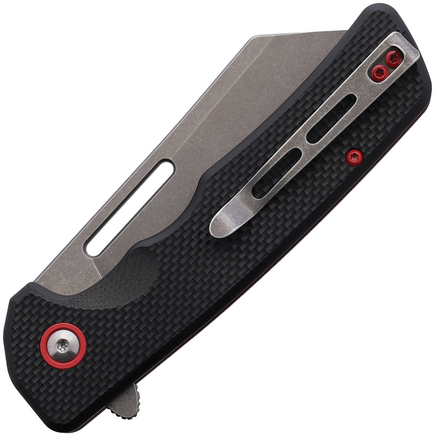 4.5″ (11.43cm) closed. 3.25″ (8.26cm) stonewash finish stainless sheepsfoot blade. Black G10 handle. Extended tang. Thumb pull. Pocket clip. Red liners. Boxed.