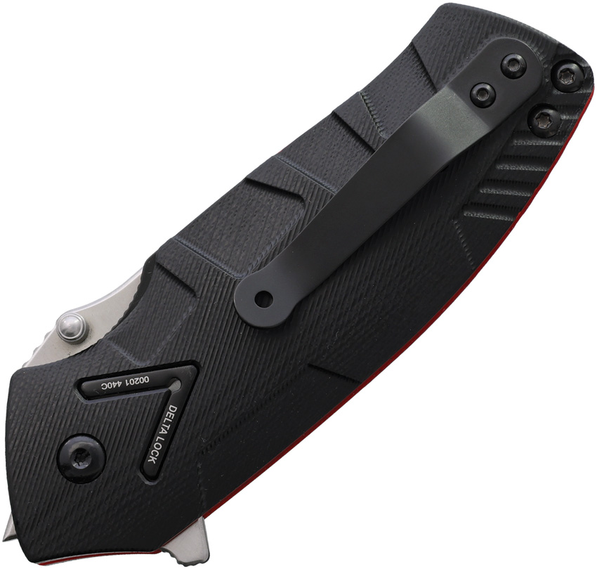4.88″ (12.4cm) closed. 3.75″ (9.53cm) satin finish 440C stainless drop point blade. Black G10 handle. Thumb stud. Extended tang. Pocket clip. Red liners. Boxed.