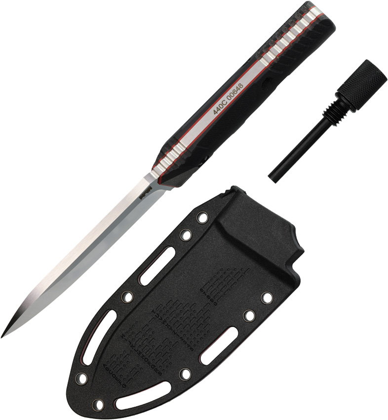 9.5″ (24.13cm) overall. 4.5″ (11.43cm) satin finish 440C stainless drop point blade. Black G10 handle. Full tang. Lanyard hole. Red liners. Black Kydex sheath. Boxed.