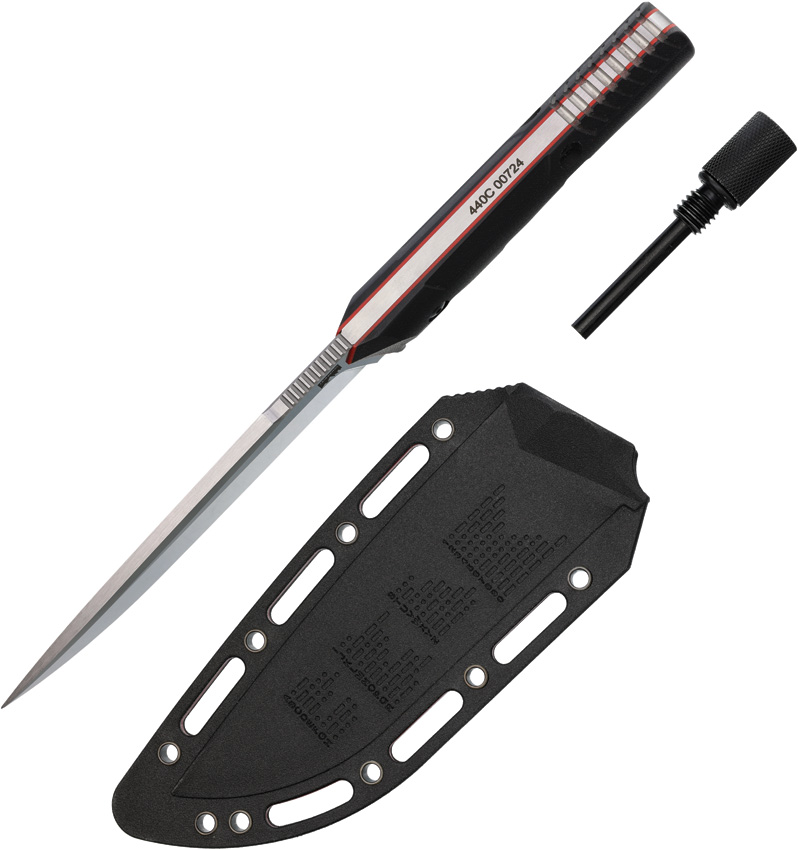 10.75″ (27.31cm) overall. 5.5″ (13.97cm) satin finish 440C stainless drop point blade. Black G10 handle. Full tang. Lanyard hole. Red liners. Black Kydex sheath. Boxed.