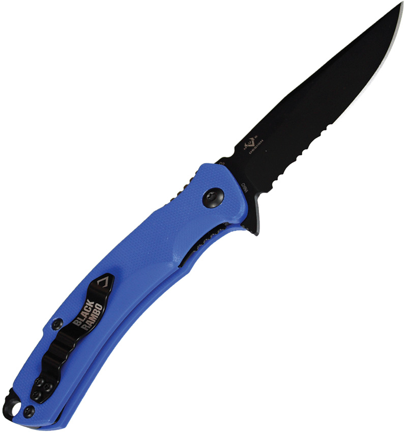 4″ (10.16cm) closed. 2.9″ (7.37cm) black PVD coated partially serrated D2 tool steel clip point blade. Blue G10 handle. Extended tang. Lanyard hole. Pocket clip. Clam packed.