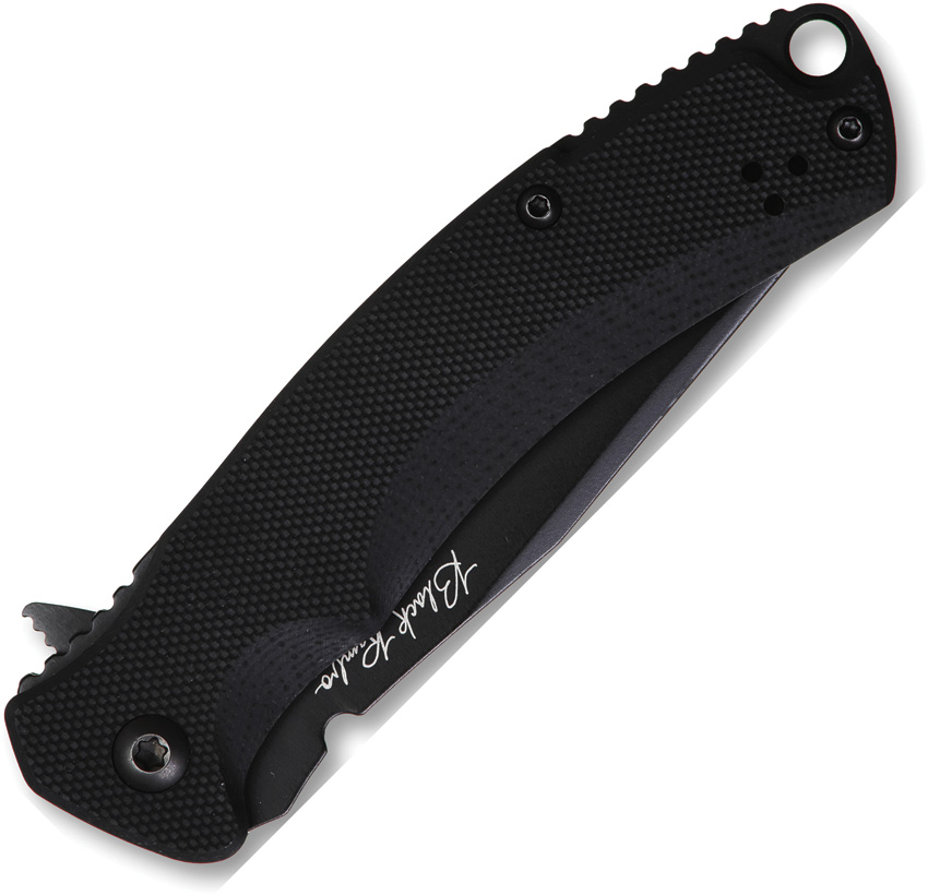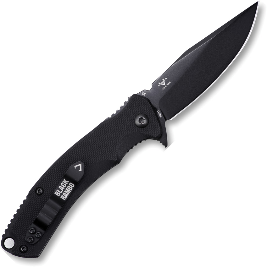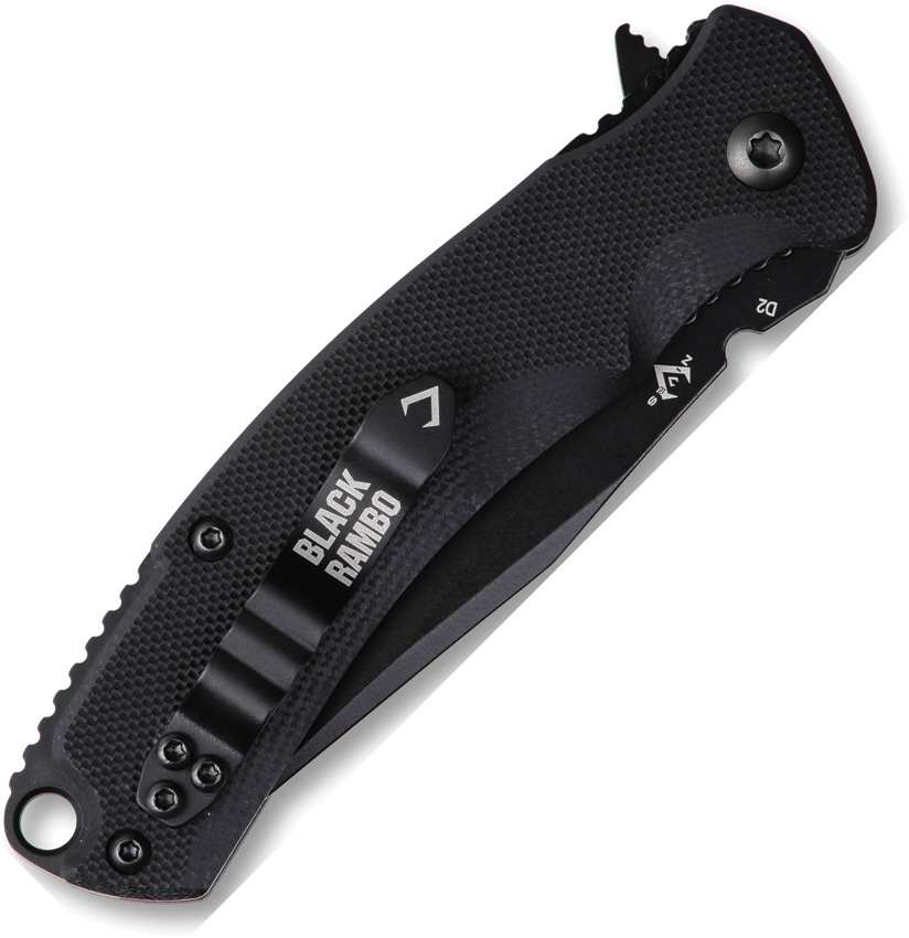 4″ (10.16cm) closed. 2.9″ (7.37cm) black PVD coated D2 tool steel clip point blade. Black G10 handle. Extended tang. Lanyard hole. Pocket clip. Clam packed.