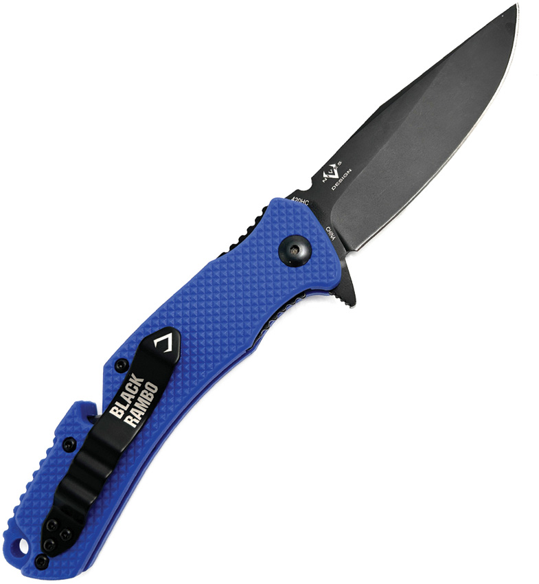5.00″ (12.7cm) closed. 3.75″ (9.53cm) black PVD coated 420HC stainless clip point blade. Blue textured FRN handle. Belt/cord cutter. Extended tang. Lanyard hole. Pocket clip. Fire strike notch. Clam packed.