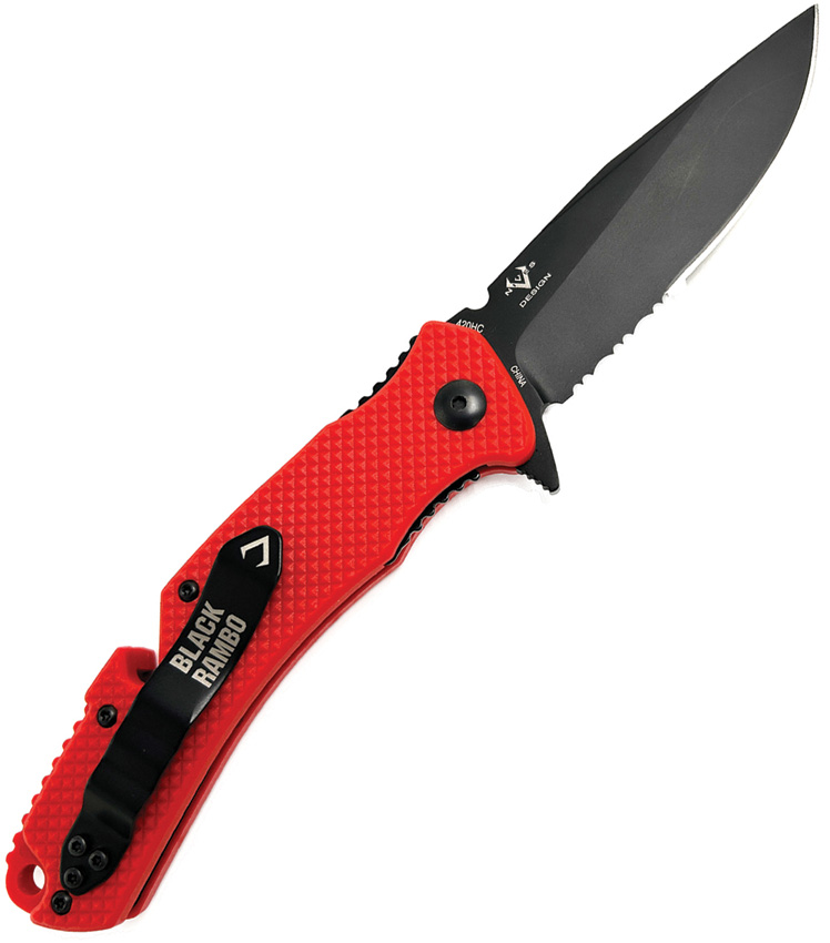 5.00″ (12.7cm) closed. 3.75″ (9.53cm) black PVD coated 420HC stainless clip point blade. Red textured FRN handle. Belt/cord cutter. Extended tang. Lanyard hole. Pocket clip. Fire strike notch. Clam packed.