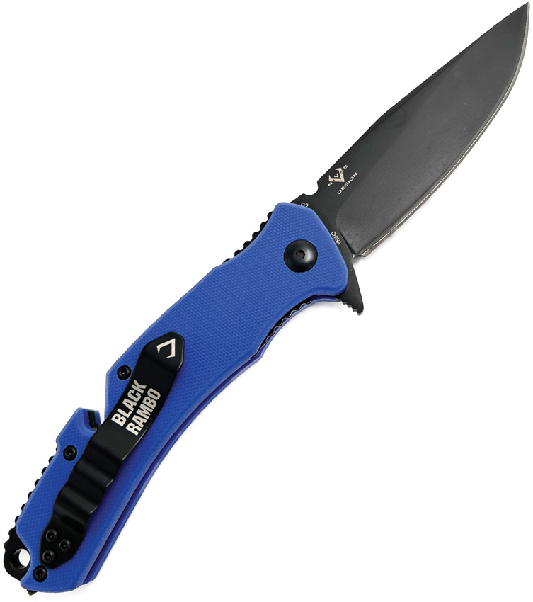 5.13″ (13.03cm) closed. 3.75″ (9.53cm) black PVD coated D2 tool steel clip point blade. Blue G10 handle. Belt/cord cutter. Extended tang. Lanyard hole. Pocket clip. Glass breaker. Fire strike notch. Clam packed.