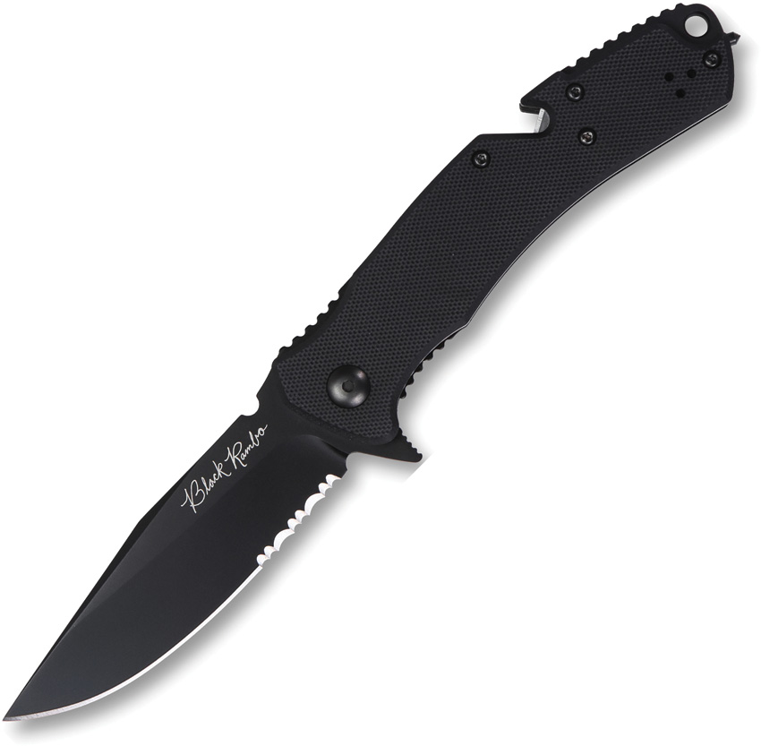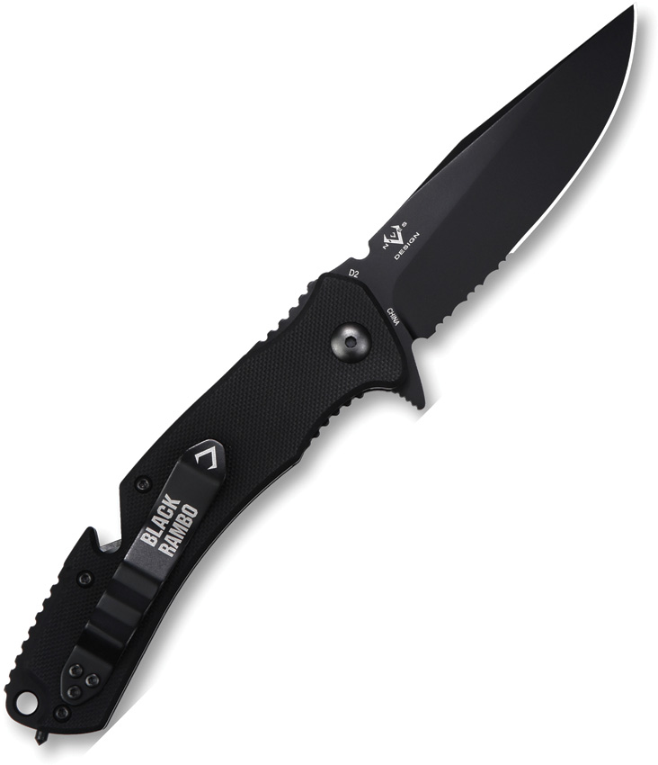 5.13″ (13.03cm) closed. 3.75″ (9.53cm) black PVD coated partially serrated D2 tool steel clip point blade. Black G10 handle. Belt/cord cutter. Extended tang. Lanyard hole. Pocket clip. Glass breaker. Fire strike notch. Clam packed.