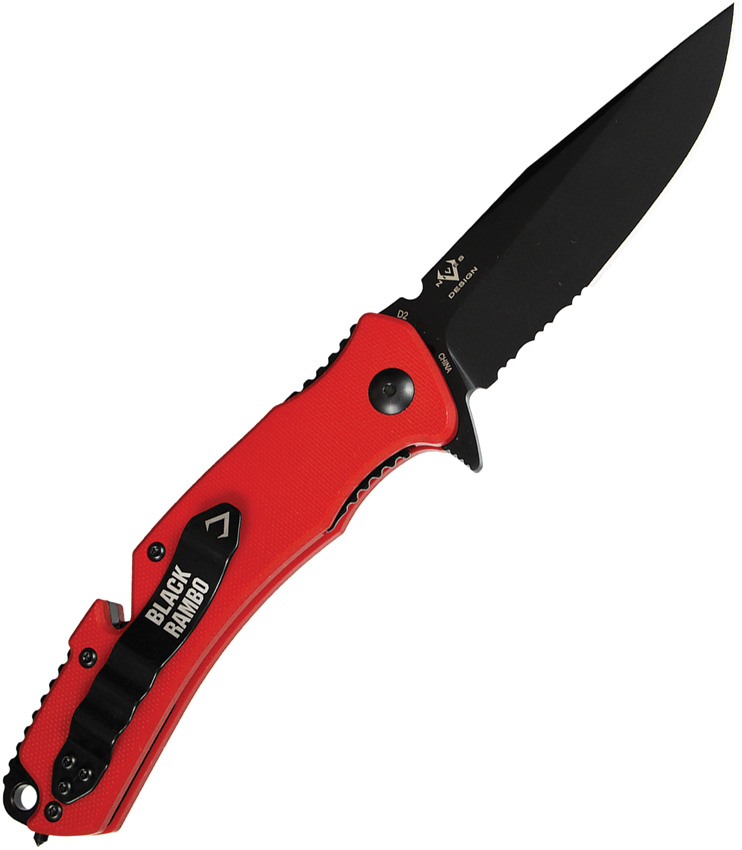 5.13″ (13.03cm) closed. 3.75″ (9.53cm) black PVD coated partially serrated D2 tool steel clip point blade. Red G10 handle. Belt/cord cutter. Extended tang. Lanyard hole. Pocket clip. Glass breaker. Clam packed.