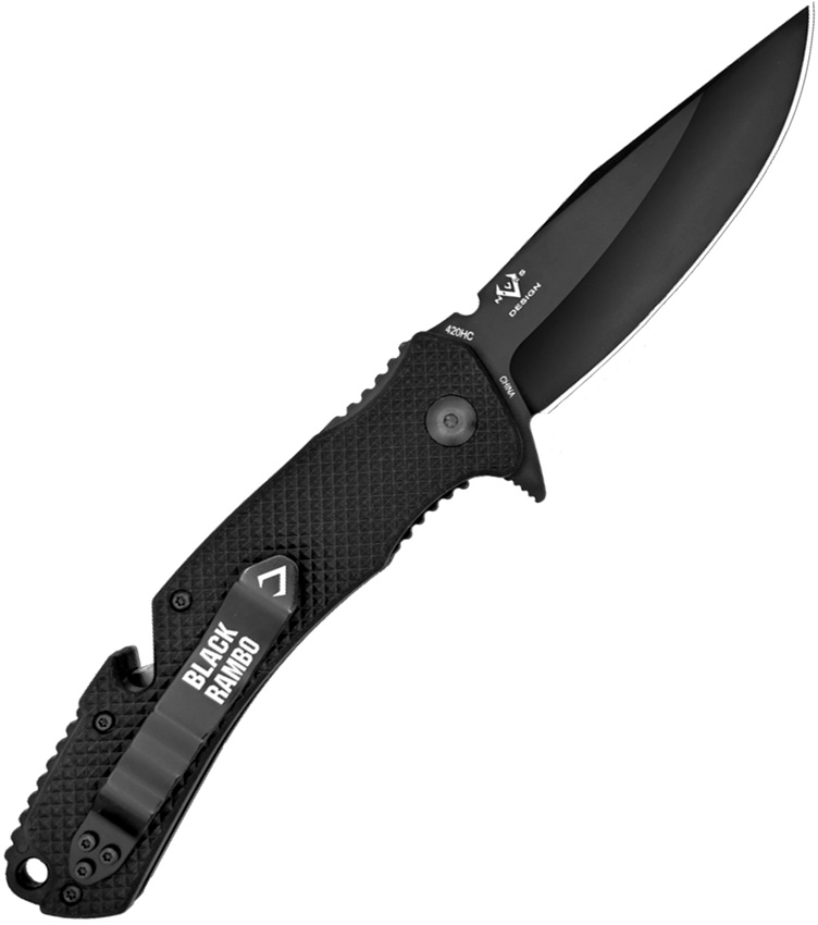 5.00″ (12.7cm) closed. 3.75″ (9.53cm) black PVD coated 420HC stainless clip point blade. Black textured FRN handle. Belt/cord cutter. Extended tang. Lanyard hole. Pocket clip. Fire strike notch. Clam packed.