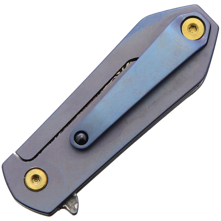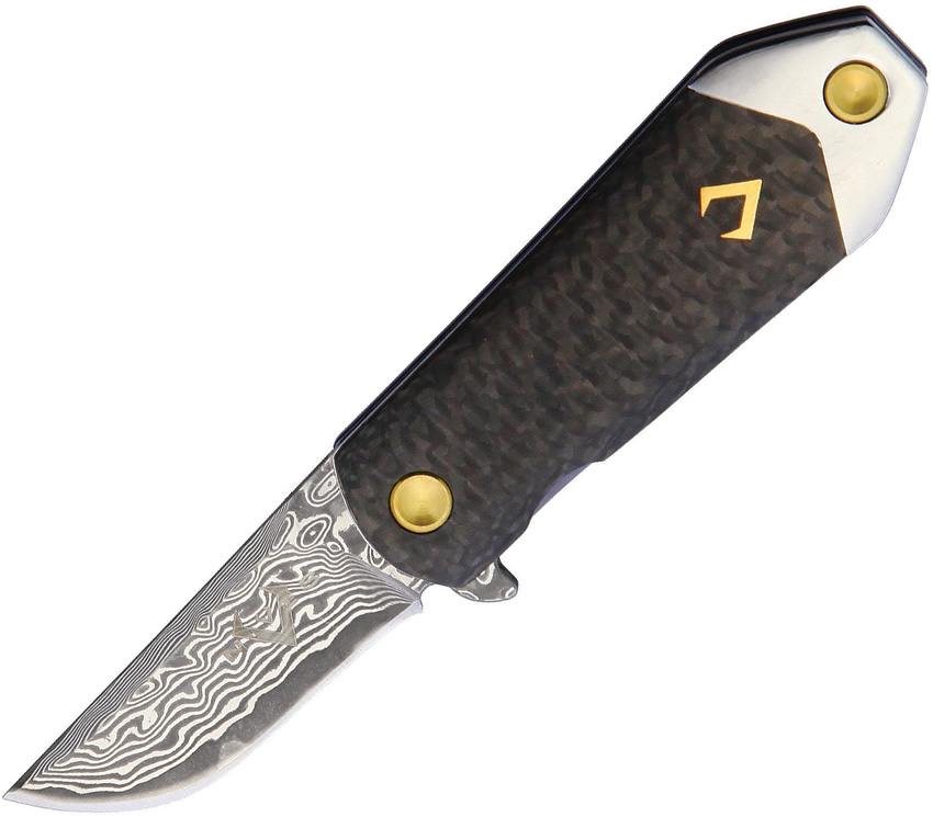 2.25″ (5.72cm) closed. 1.5″ (3.81cm) Damascus steel blade. Carbon fiber handle with blue titanium back handle. Extended tang. Pocket clip. Gift tin.