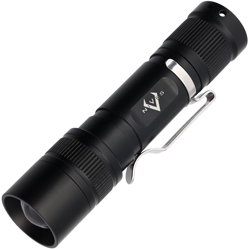4″ overall. Water resistant. Impact resistant. Strobe. Clip. Lanyard. High power LED. 160 max lumens. Special steel optical lenses. Explosion proof. Adjustable beam. UV mode. Requires (1) AAA battery (included). Aluminum construction. Color: Black. Boxed.