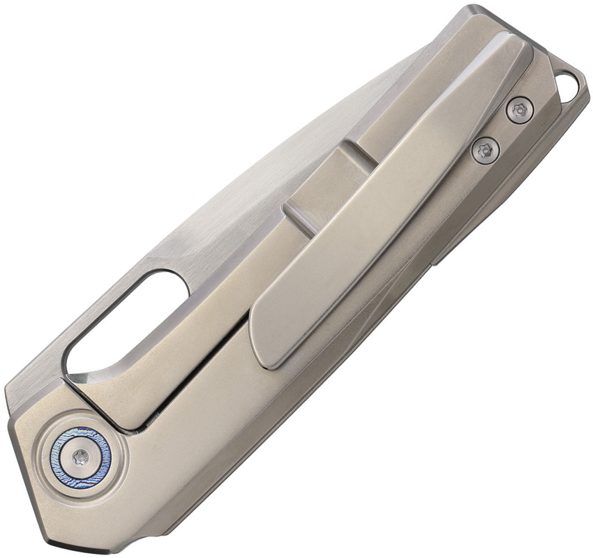 4.5″ (11.43cm) closed. 3.5″ (8.89cm) satin finish Bohler M390 stainless drop point blade. Gray tumbled finish titanium handle. Thumb pull. Lanyard hole. Pocket clip. Comes in wooden storage box. Boxed.