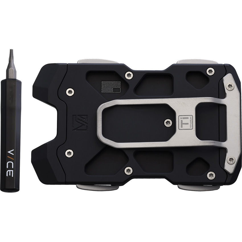 Dimensions: 2.35″ x 3.65″ x 0.32″. Black anodized finish aircraft grade aluminum body with carbon fiber inlay. Titanium hardware. Holds up to 12 cards and 15 bills securely. RFID protection. Titanium money clip. Boxed.
