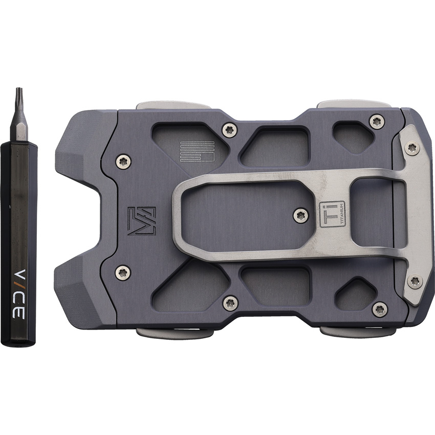 Dimensions: 2.35″ x 3.65″ x 0.32″. Gray anodized finish aircraft grade aluminum body. Titanium hardware. Holds up to 12 cards and 15 bills securely. RFID protection. Titanium money clip. Boxed.
