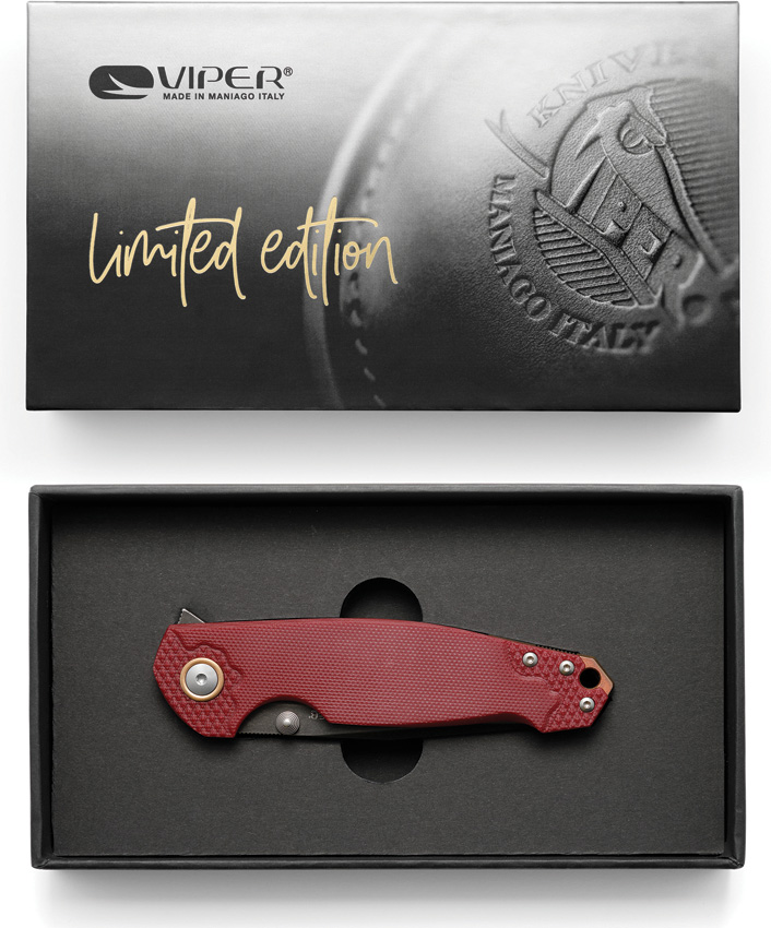 4.5″ (11.43cm) closed. 3.25″ (8.26cm) black stonewash finish Bohler M390 stainless blade. Red G10 handle. Extended tang. Thumb stud. Lanyard hole. Pocket clip. One-piece phosphor bronze spacer. Boxed.