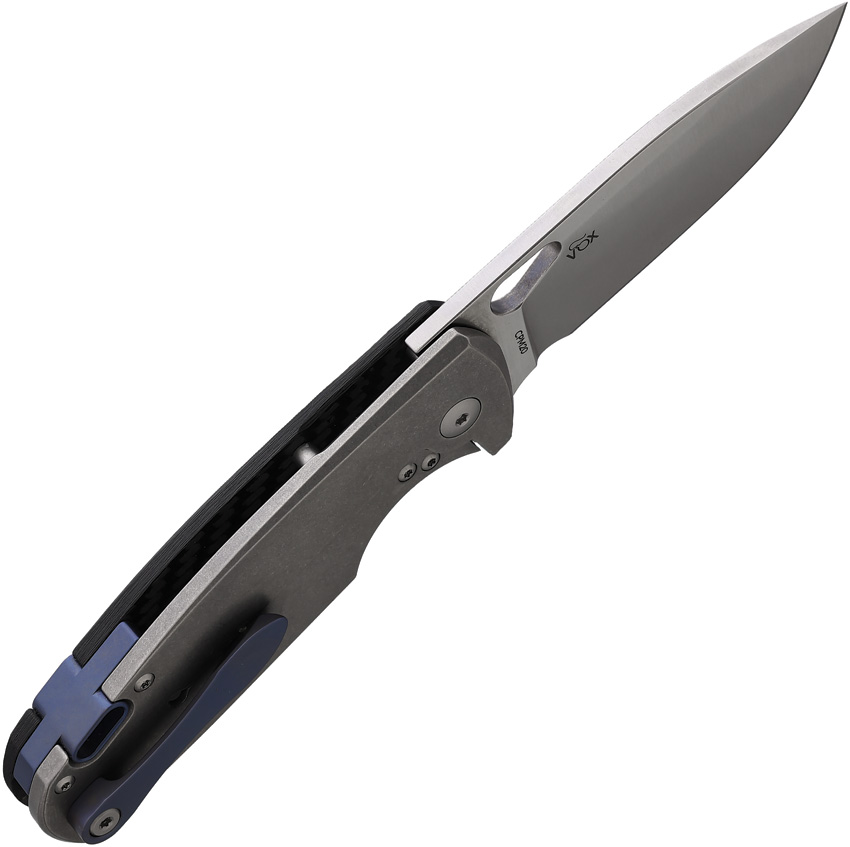 4.25″ (10.8cm) closed. 3.25″ (8.26cm) satin finish CPM-20CV stainless drop point blade. Carbon fiber handle with stonewash finish titanium back handle. Thumb pull. Extended tang. Pocket clip. Blue anodized single titanium spacer. Boxed.