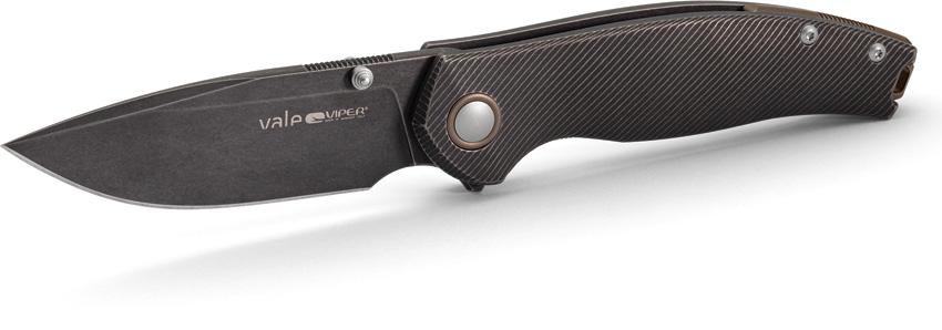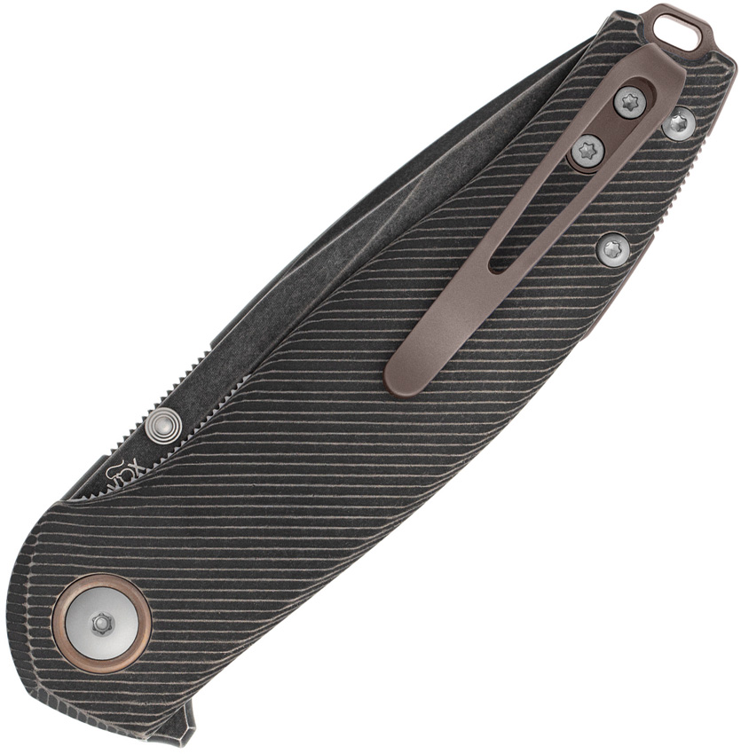 4.13″ (10.49cm) closed. 3″ (7.62cm) black stonewash finish MagnaCut steel blade. Black and bronze stonewash finish titanium handle. Extended tang. Thumb stud. Lanyard hole. Pocket clip. Boxed.