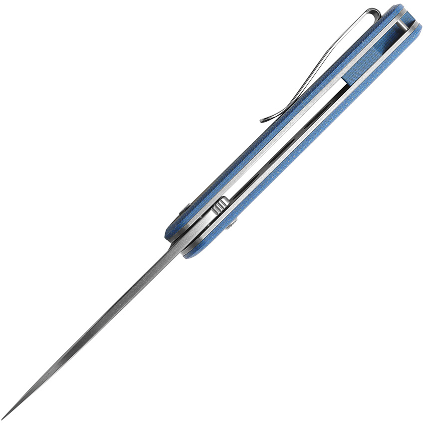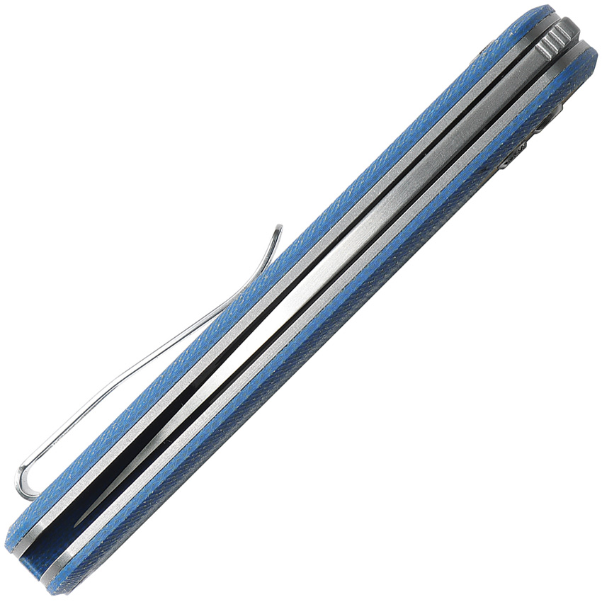 4.13″ (10.49cm) closed. 3″ (7.62cm) satin finish 14C28N Sandvik stainless modified drop point blade. Blue canvas micarta handle. Pocket clip. Boxed.