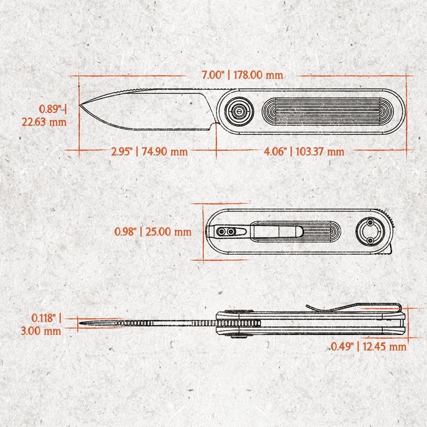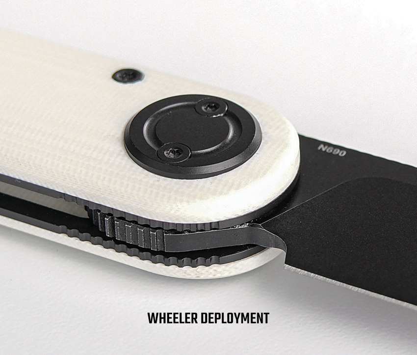 4″ (10.16cm) closed. 3″ (7.62cm) black stonewash finish Bohler N690 stainless drop point blade. White G10 handle. Extended tang. Pocket clip. Black nylon pouch. Boxed.