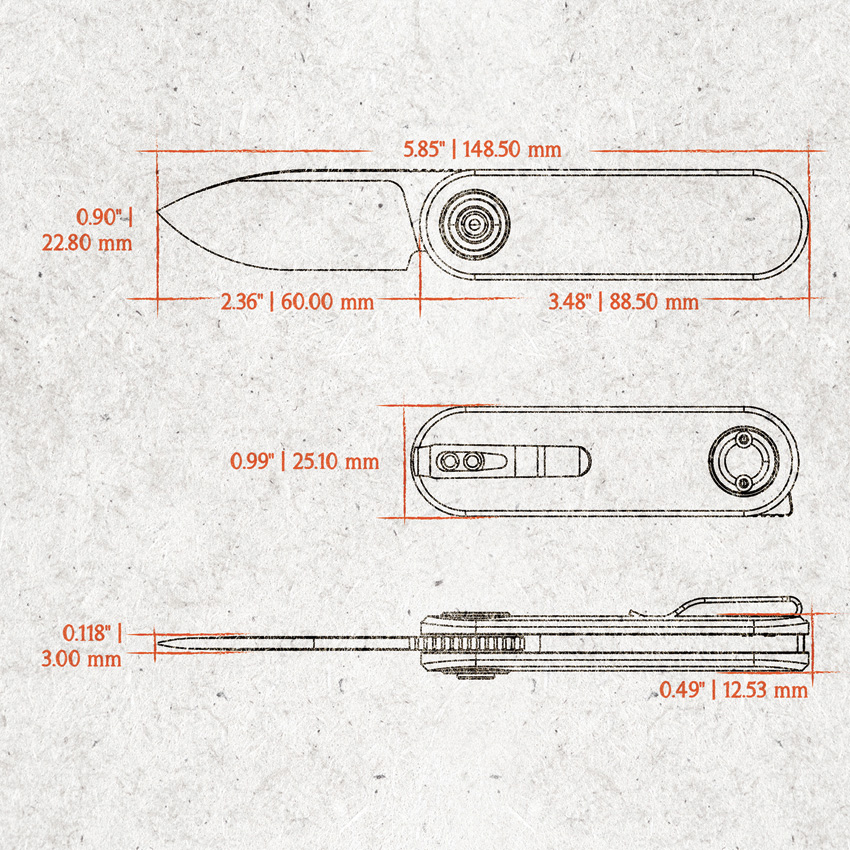 4″ (10.16cm) closed. 3″ (7.62cm) satin finish flat ground 14C28N Sandvik stainless drop point blade. Dark slate aluminum handle. Extended tang. Pocket clip. Black nylon pouch. Boxed.