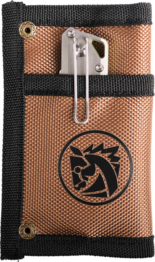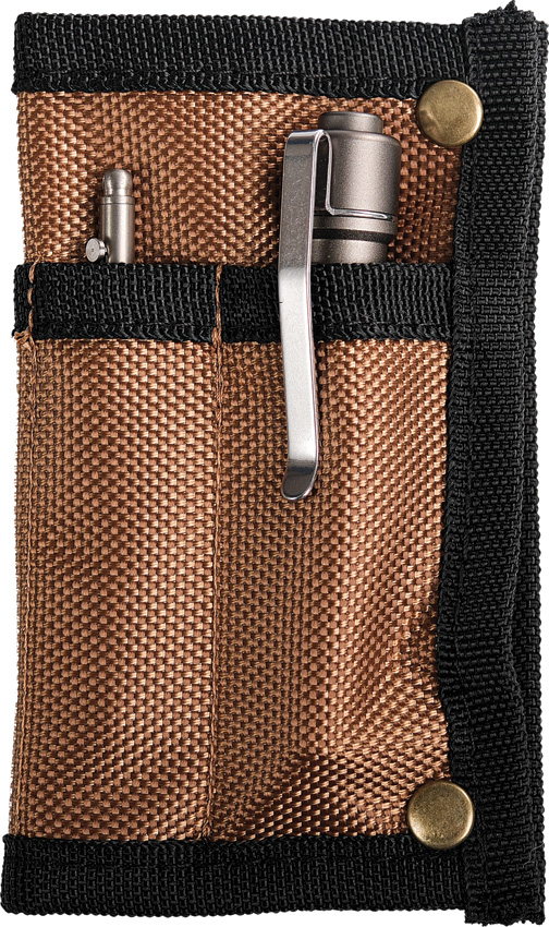 5″ overall. Folds with metal snaps. Three pockets. Nylon construction. Color: Brown and black. Hang packaged.