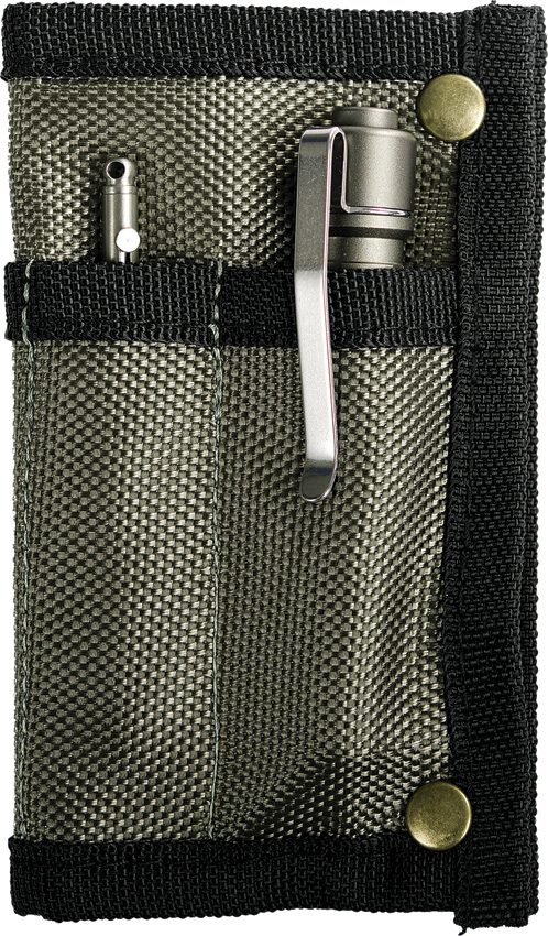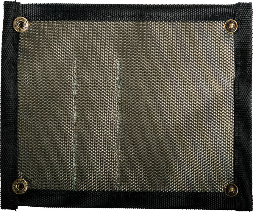 5″ overall. Folds with metal snaps. Three pockets. Nylon construction. Color: Green and black. Hang packaged.