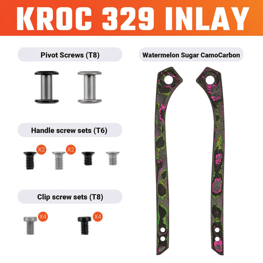 Includes: (2) Pivot screws (black, gray); (2) T6 Handle screw sets (Black, Gray); (2) T8 clip screw sets (Black, Gray); (1) Pair inlays. Carbon fiber construction. Color: Watermelon Sugar Camo. Boxed.