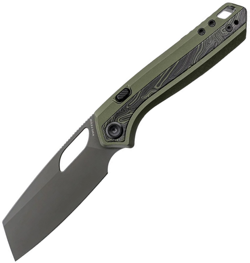4.38″ (11.13cm) closed. 3.25″ (8.26cm) flat ground S35VN stainless sheepsfoot blade. Olive aluminum handle with Topo G10 inlay. Thumb pull. Lanyard hole. Pocket clip. Destroyer gray blade. Black nylon zippered storage case. Boxed.