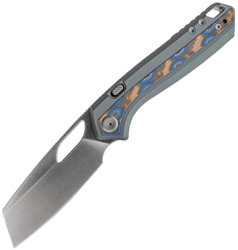 4.38″ (11.13cm) closed. 3.25″ (8.26cm) satin finish S35VN stainless sheepsfoot blade. Gray aluminum handle with Ocean micarta inlay. Thumb pull. Lanyard hole. Pocket clip. Black nylon zippered storage case. Boxed.