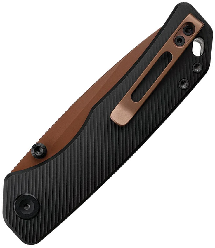 4.25″ (10.8cm) closed. 3.25″ (8.26cm) 154CM stainless drop point blade. Black aluminum handle. Thumb stud. Lanyard hole. Pocket clip. Copper Dune finish blade. Black nylon zippered storage case. Boxed.