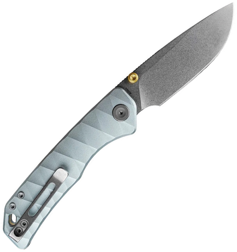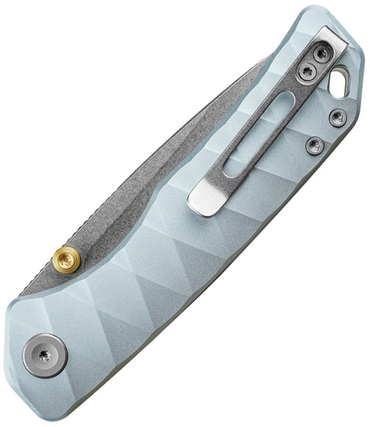4.25″ (10.8cm) closed. 3.25″ (8.26cm) stonewash finish 154CM stainless drop point blade. Light blue sculpted aluminum handle. Thumb stud. Lanyard hole. Pocket clip. Black nylon zippered storage case. Boxed.