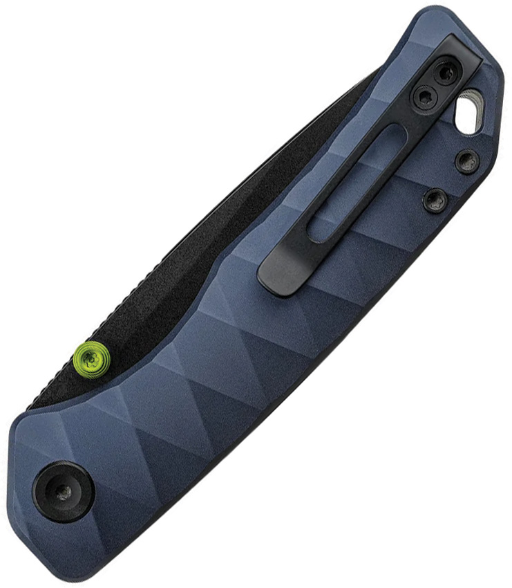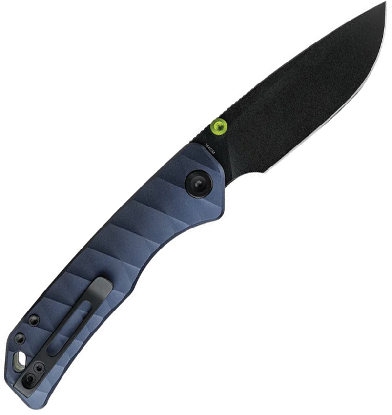 4.25″ (10.8cm) closed. 3.25″ (8.26cm) black stonewash finish 154CM stainless drop point blade. Slate blue sculpted aluminum handle. Thumb stud. Lanyard hole. Pocket clip. Black nylon zippered storage case. Boxed.
