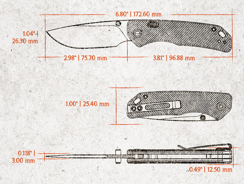 3.88″ (9.86cm) closed. 3″ (7.62cm) black stonewash finish 154CM stainless drop point blade. Orange fluted aluminum handle. Thumb stud. Lanyard hole. Pocket clip. Black nylon zippered storage case. Boxed.