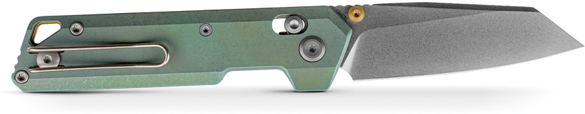 4.13″ (10.49cm) closed. 2.9″ (7.37cm) stonewash finish 154CM stainless reverse tanto blade. Green titanium handle. Thumb stud. Lanyard hole. Pocket clip. Black nylon zippered storage case. Boxed.