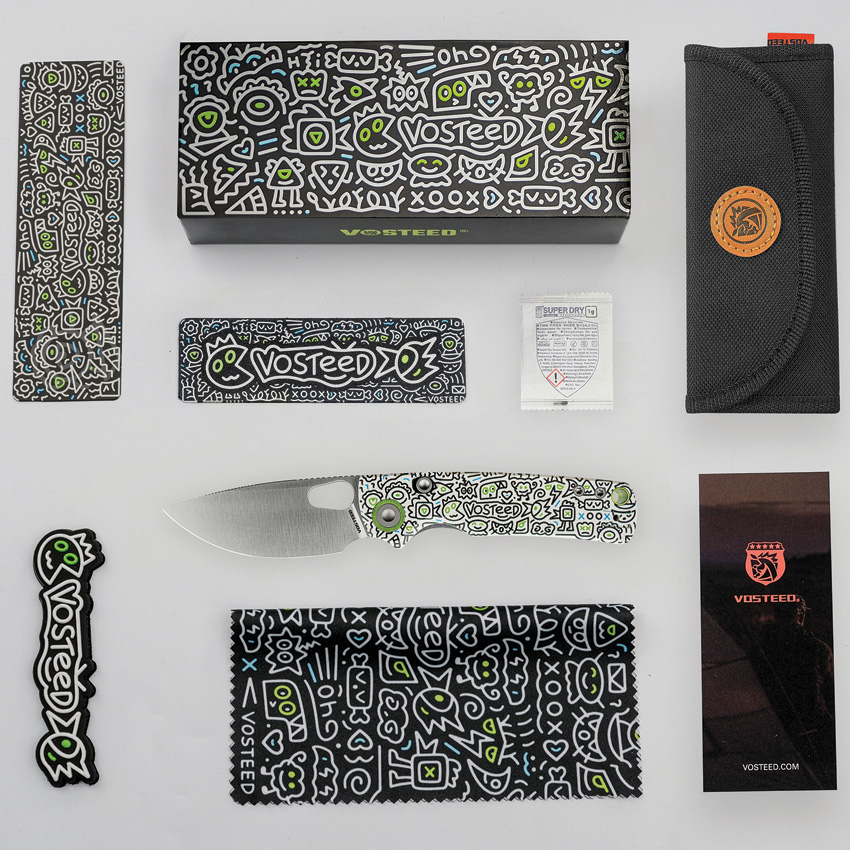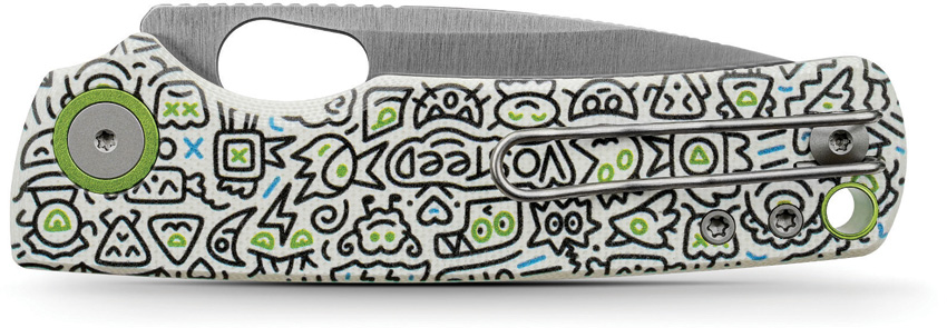4.13″ (10.49cm) closed. 3″ (7.62cm) satin finish 14C28N Sandvik stainless drop point blade. White G10 handle. Thumb pull. Lanyard hole. Pocket clip. Doodle Monster handle artwork. Black nylon pouch. Boxed.