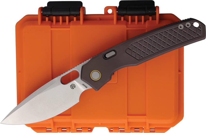 4.75″ (12.07cm) closed. 3.38″ (8.59cm) stonewash finish Elmax steel drop point blade. Purple titanium handle. Thumb pull. Lanyard hole. Pocket clip. Black nylon zippered storage case. Boxed.
