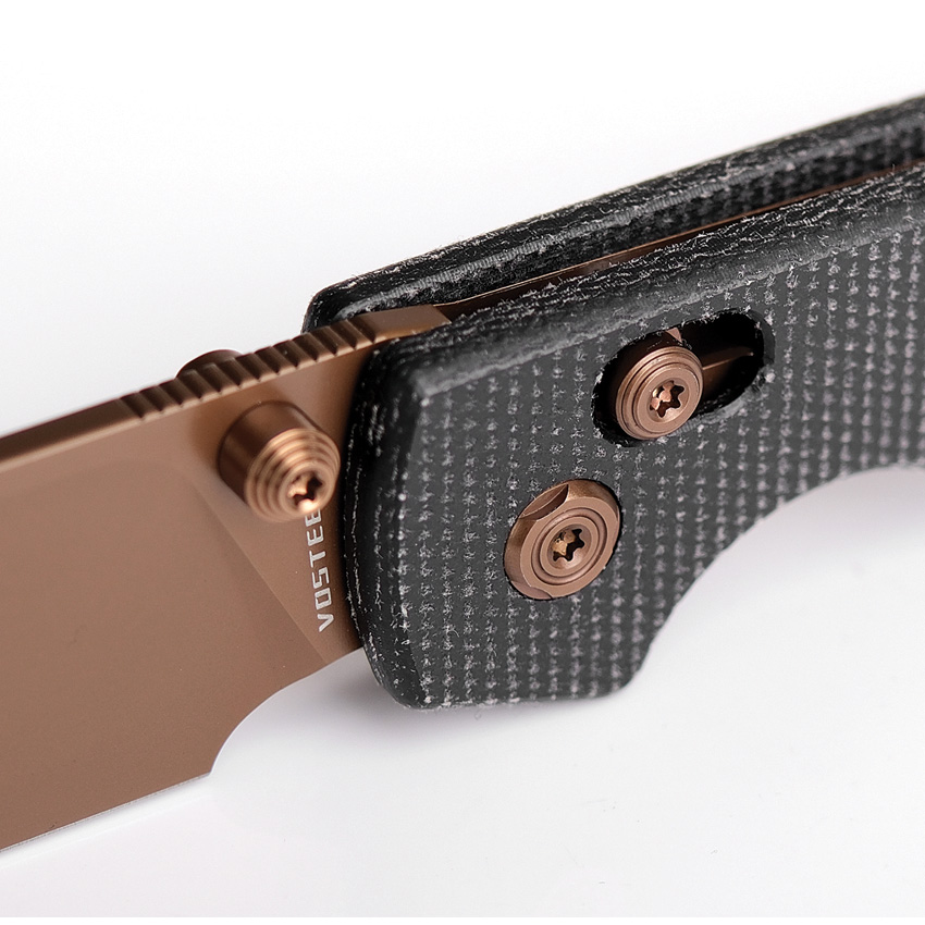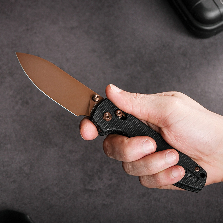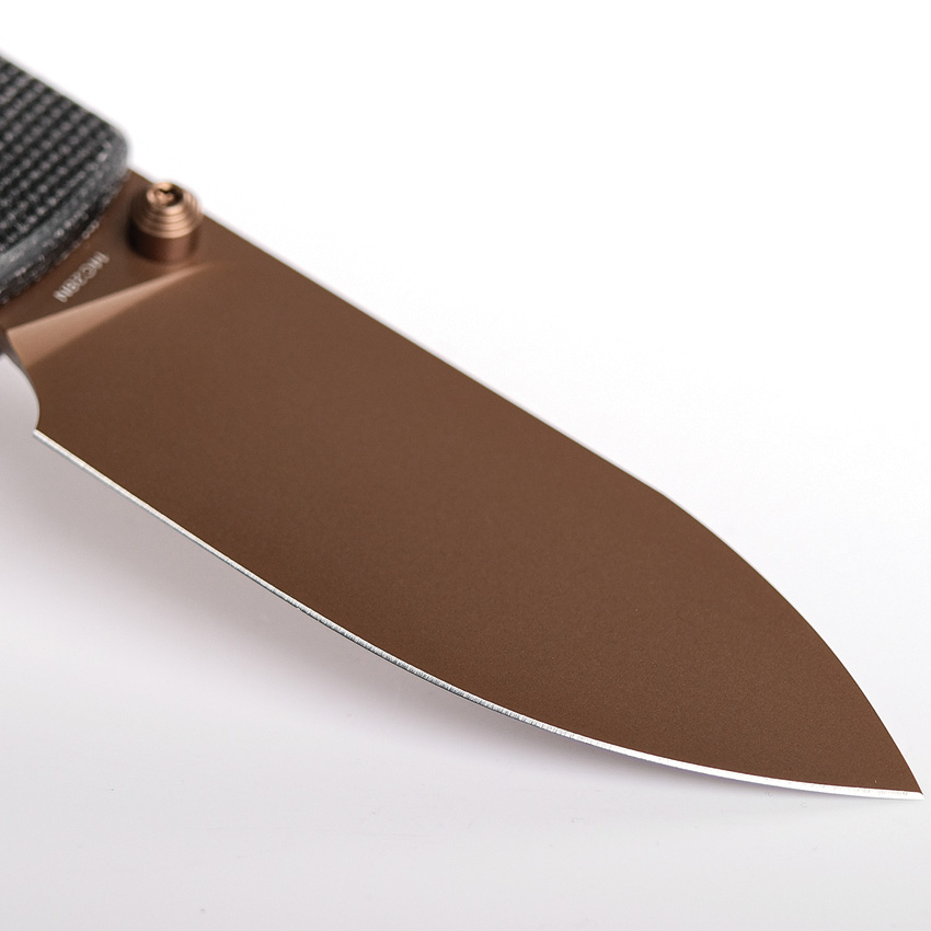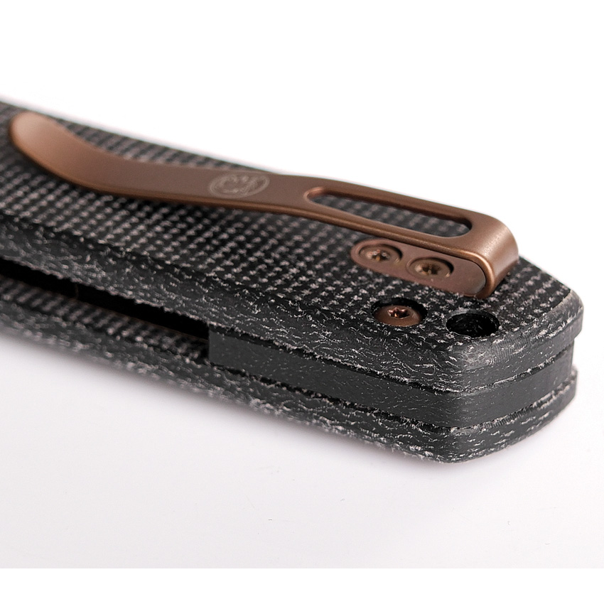 4.38″ (11.13cm) closed. 3.25″ (8.26cm) copper finish 14C28N Sandvik stainless drop point blade. Black micarta handle. Thumb stud. Lanyard hole. Pocket clip. Black nylon zippered storage case. Boxed.