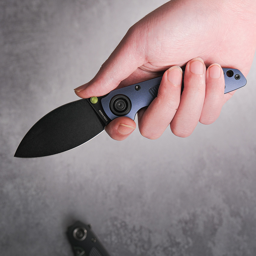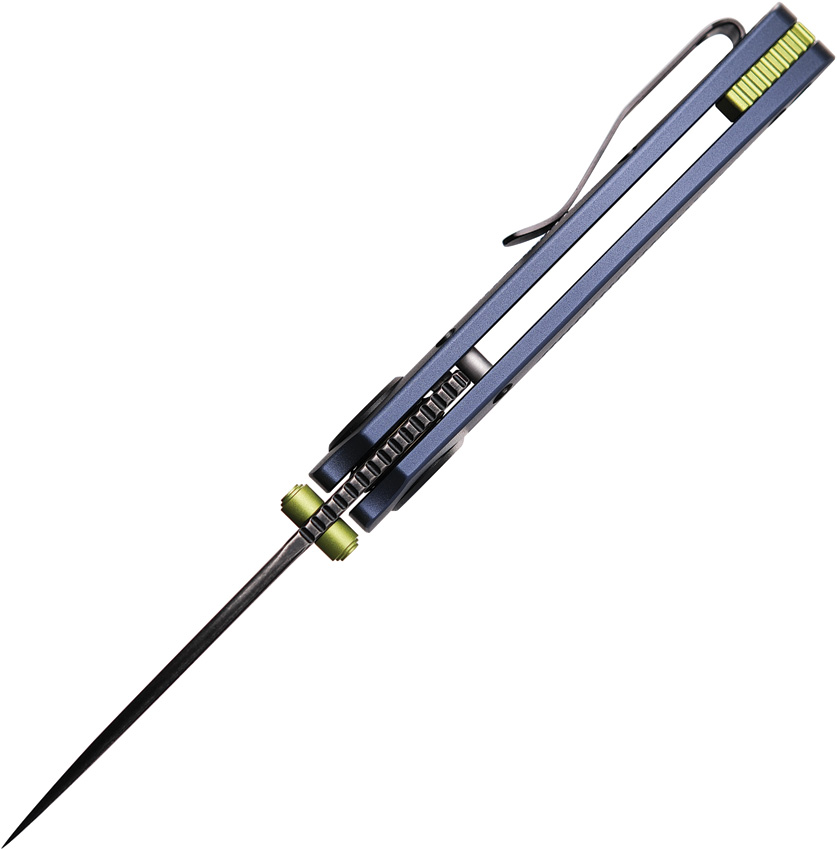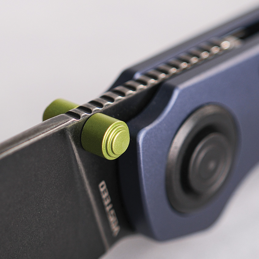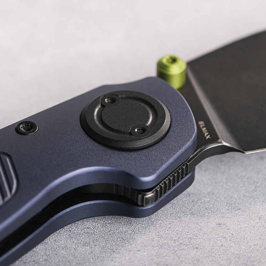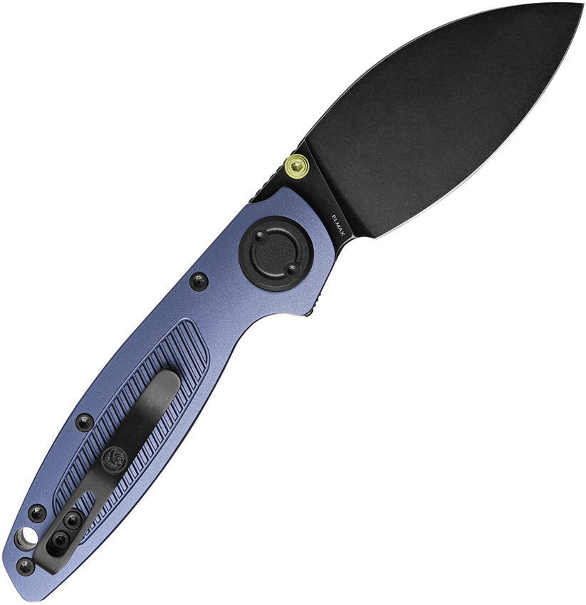 4.13″ (10.49cm) closed. 2.9″ (7.37cm) black stonewash finish Elmax steel blade. Purple aluminum handle. Thumb stud. Lanyard hole. Pocket clip. Extended tang. Black nylon zippered storage case. Boxed.