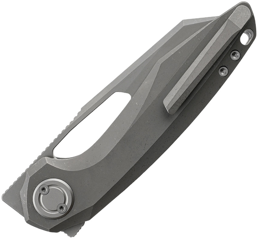 4.75″ (12.07cm) closed. 3.5″ (8.89cm) Bohler M390 stainless reverse tanto blade. Dim Gray titanium handle. Extended tang. Thumb pull. Lanyard hole. Pocket clip. Stonewash and acid wash finish blade. Black nylon zippered storage case. Boxed.