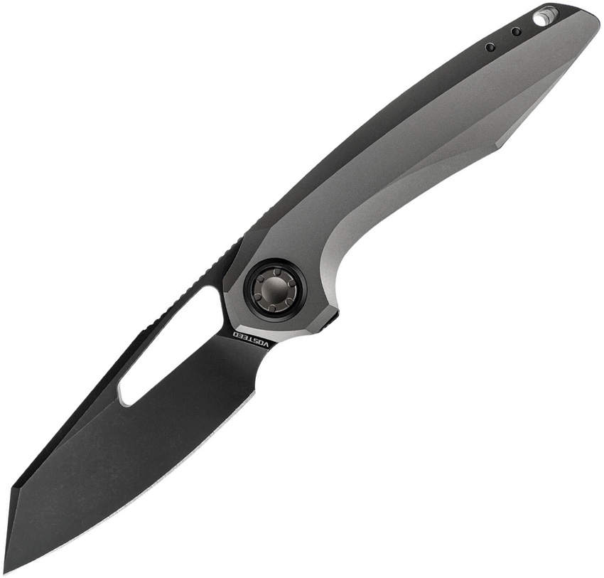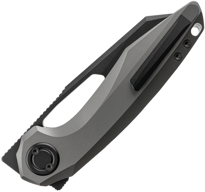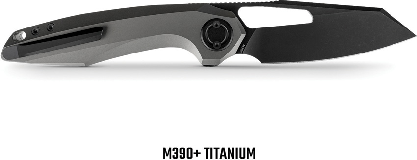 4.75″ (12.07cm) closed. 3.5″ (8.89cm) black stonewash finish Bohler M390 stainless reverse tanto blade. Dim Gray titanium handle. Extended tang. Thumb pull. Lanyard hole. Pocket clip. Black nylon zippered storage case. Boxed.