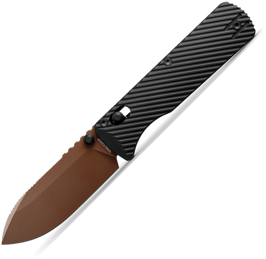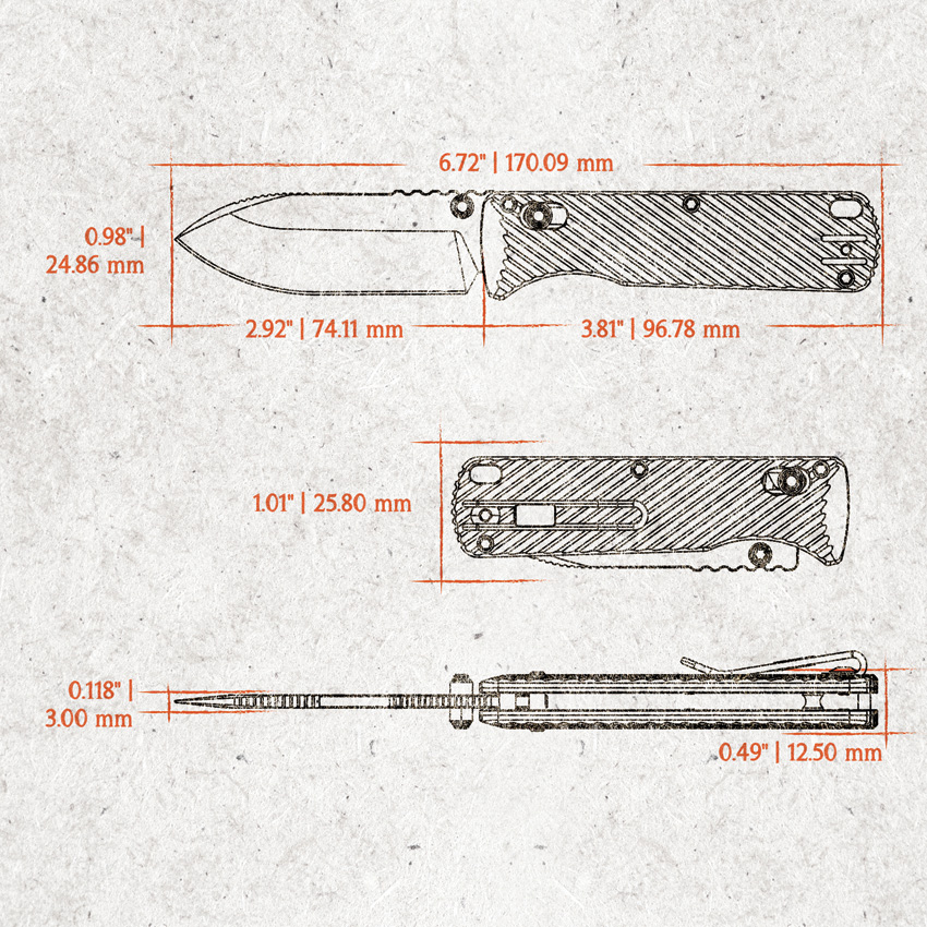 3.88″ (9.86cm) closed. 2.88″ (7.32cm) Bohler M390 stainless blade. Black sculpted aluminum handle. Thumb stud. Pocket clip. Copper Dune finish zulu blade. Quick-Swap scale system. Ball roll bar. Boxed.