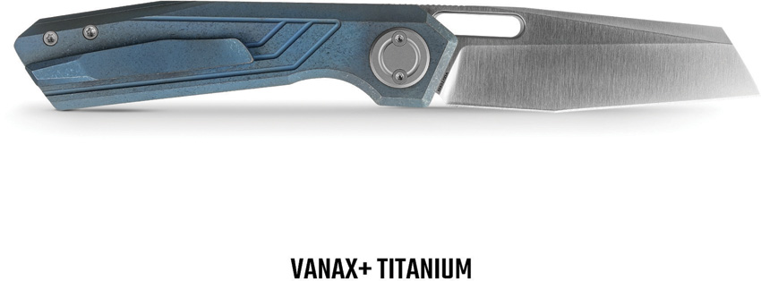 4.63″ (11.76cm) closed. 3.25″ (8.26cm) satin finish Vanax steel sheepsfoot blade. Blue titanium handle. Thumb pull. Pocket clip. Boxed.