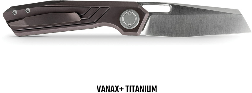4.63″ (11.76cm) closed. 3.25″ (8.26cm) satin finish Vanax steel sheepsfoot blade. Titanium handle. Thumb pull. Pocket clip. Reddish-purple handle. Boxed.