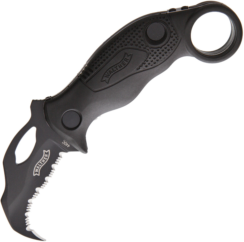 Closed: 4.5″; Blade: 2.25″ l 440C Stainless l Serrated Edge l Black Finish; Handle: Black l Synthetic; Other Info: Pocket Clip l Thumb Slot. Karambit blade. Finger ring pommel. Black nylon belt pouch. Boxed.