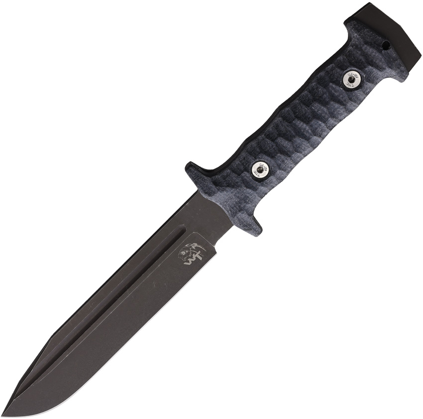 12.5″ (31.75cm) overall. 7″ (17.78cm) black DLC coated D2 tool steel blade. Blue-Gray sculpted micarta handle. Full, extended tang. Lanyard hole. Black Kydex MOLLE compatible belt sheath. Bulk packed.