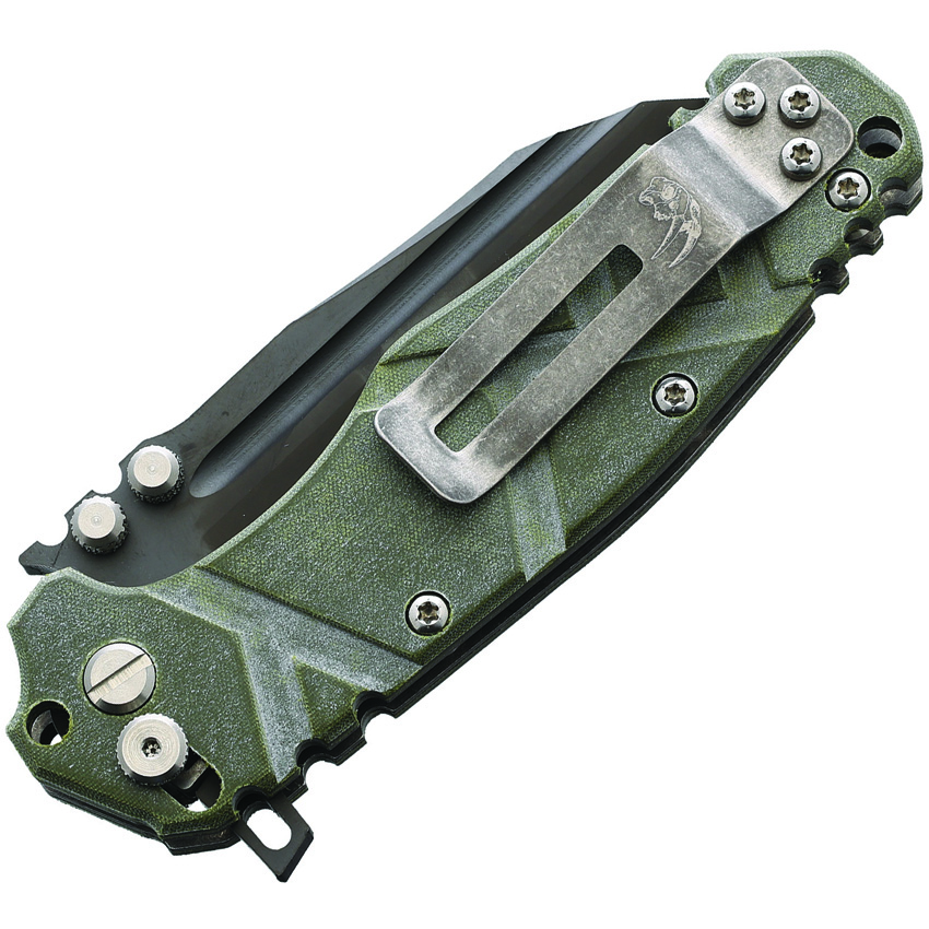 4.75″ (12.07cm) closed. 3.5″ (8.89cm) black finish D2 tool steel blade. Green sculpted titanium handle. Extended tang. Lanyard hole. Pocket clip. Thumb stud. CNC machined lock. Handmade in Italy. Comes packaged in plastic tube.