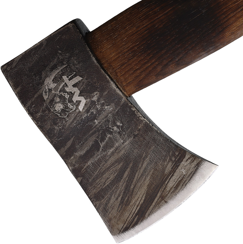 15″ overall. 5.5″ 5160 carbon steel axe head with 3.25″ cutting edge. Stained American Hickory handle. Raw stripes finish axe head. Brown leather sheath. Bulk packed.