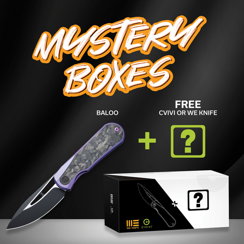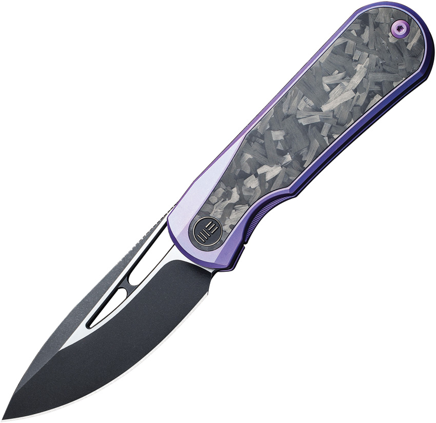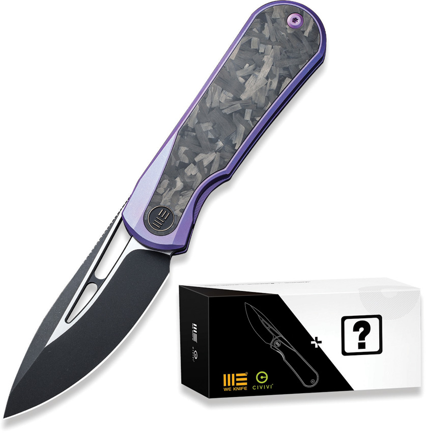 4.5″ (11.43cm) closed. 3.25″ (8.26cm) two-tone finish CPM-20CV stainless drop point blade. Purple titanium handle with Shredded carbon fiber inlay. Thumb pull. Pocket clip. Comes with one free mystery WE or CIVIVI model. Boxed.