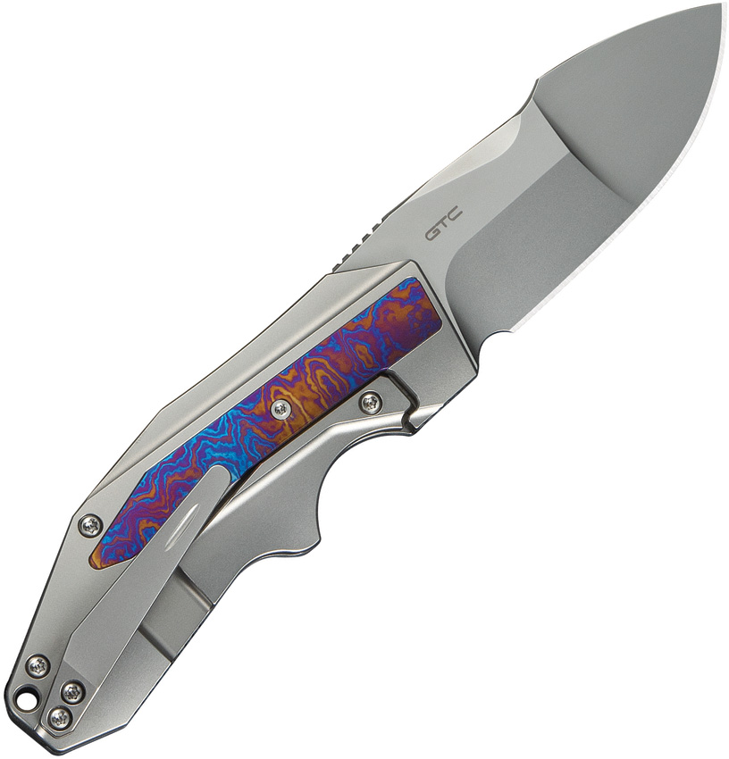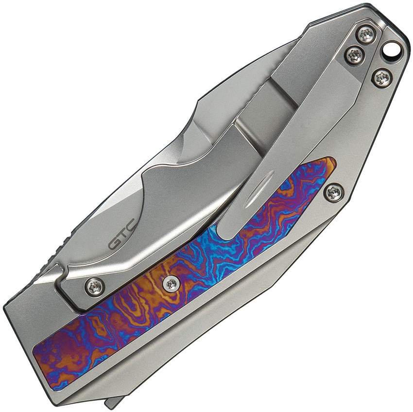 4″ (10.16cm) closed. 3″ (7.62cm) bead blast finish CPM-20CV stainless spear point blade. Bead blast finish titanium handle with Timascus inlay. Extended tang. Pocket clip. Lanyard hole. Compound ground blade. Black nylon pouch. Boxed.
